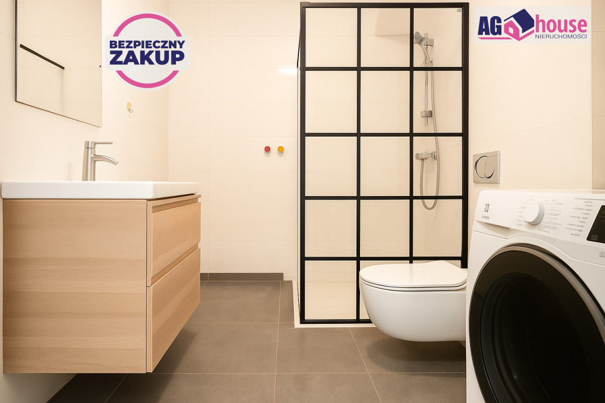 - Łazienka z kabiną prysznicową i pralko-suszarką