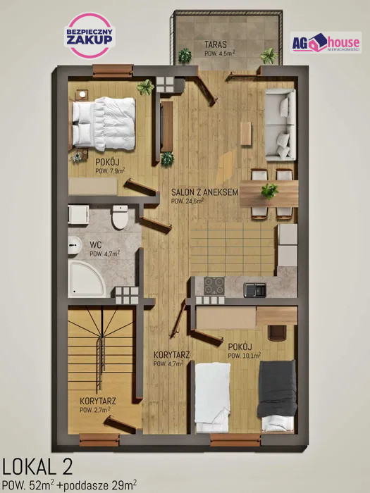 _ Niniejsze ogłoszenie i zawarte w nim informacje, treści oraz podane w powyższej treści ceny powyższa oferta ma charakter informacyjny i nie stanowią oferty handlowej w rozumieniu art. 66 kodeksu cywilnego. Zawarte w ogłoszeniu informacje na temat nieruchomości dotyczące ofert sprzedaży lub najmu nieruchomości mogą uleć modyfikacji lub zmianom w zależności od informacji przekazywanych od osób posiadających prawo do nieruchomości. Biuro AGhouse Nieruchomości dba, aby oferty były aktualizowane na bieżąco. Nasi doradcy dokładają wszelkich starań, aby oferta nieruchomości zamieszczona przez nasze biuro odpowiadała stanowi faktycznemu nieruchomości.